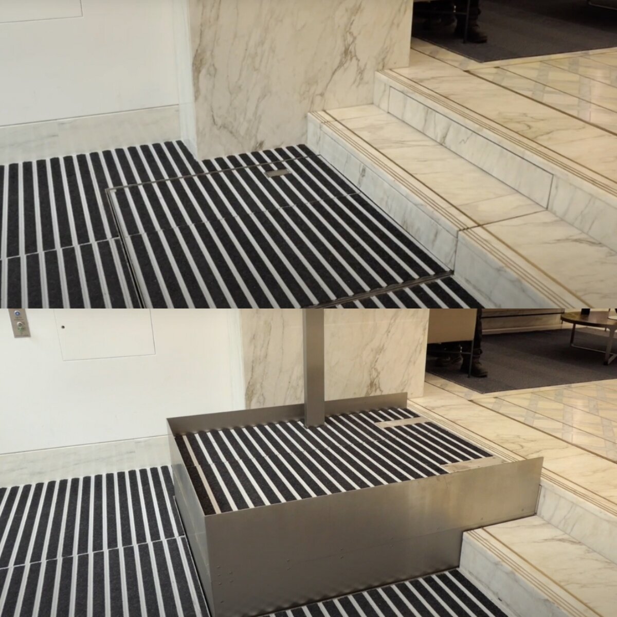A retracting lift conceals itself beneath the steps when not in use, offering a seamless, hidden solution that protects a building's heritage design.